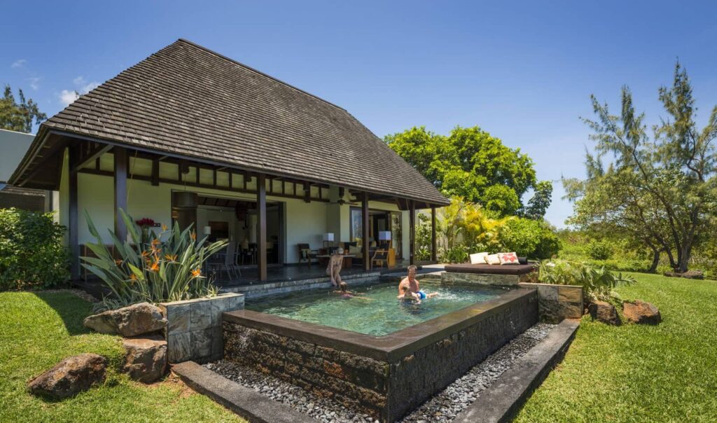 Die strohgedeckten Dächer der Villen im Mauritius At Anahita, das Naturholz und der Vulkanstein vermitteln den Gästen den mauritischen Charme. Alle Villen verfügen über eine wunderschön bepflanzte Terrasse und ein Open-Air-Bad mit Badewanne und Gartendusche.