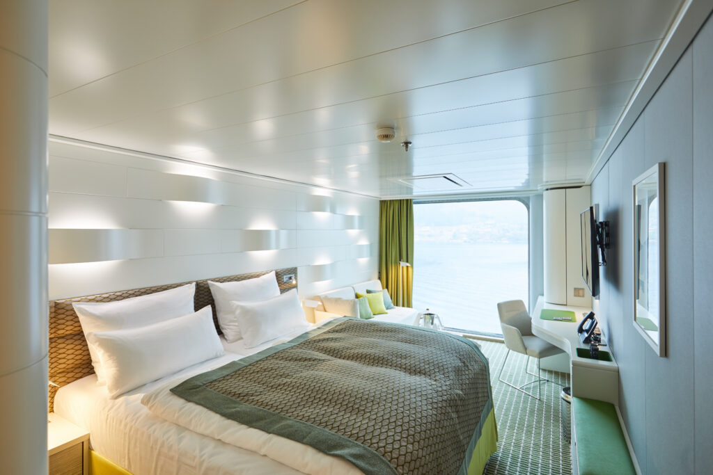 Die Kabinen und Suiten sind modern, hell und großzügig gestaltet, viele mit eigenem Balkon. Sie bieten gehobenen Hotelstandard mit luxuriösen Annehmlichkeiten und einem klaren Design, das Raum und Ruhe schafft.